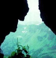 This rock cave den was discovered at about 3,800 feet on Eagle Peak, the highest mountain on Admiralty island. Used by a radio-collared female brown bear, the den was on a steep slope facing over a beautiful subalpine valley. Many of these cave dens have likely been used by different bears for centuries.
